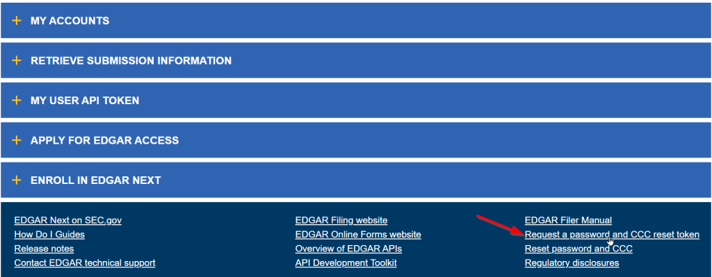 1. Sign in to the new EDGAR Filer Management website. Scroll down and select Request a password and CCC reset token.