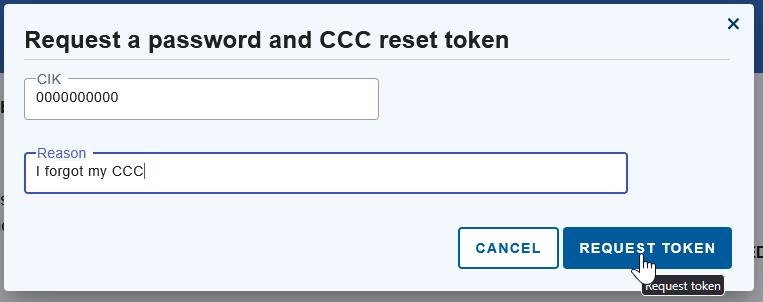 2. Enter the CIK of the EDGAR account and a reason for update (e.g., “forgot my CCC”). Select REQUEST TOKEN.
