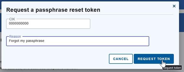 3. Enter the CIK of the EDGAR account that requires a new passphrase and a reason for update (e.g., “forgot my passphrase”). Select REQUEST TOKEN.