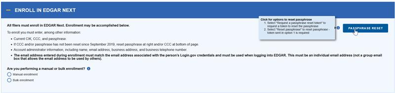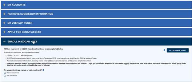 4. Return to the EDGAR Filer Management website, select ENROLL IN EDGAR NEXT, then PASSPHRASE RESET, and then Reset Passphrase.