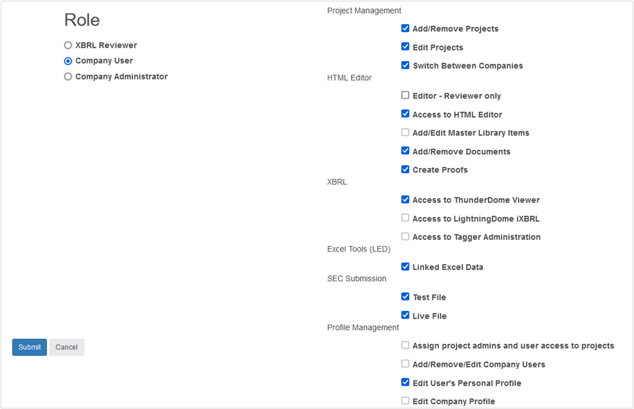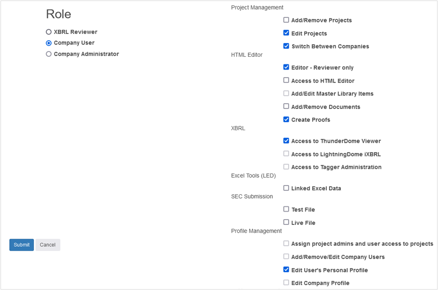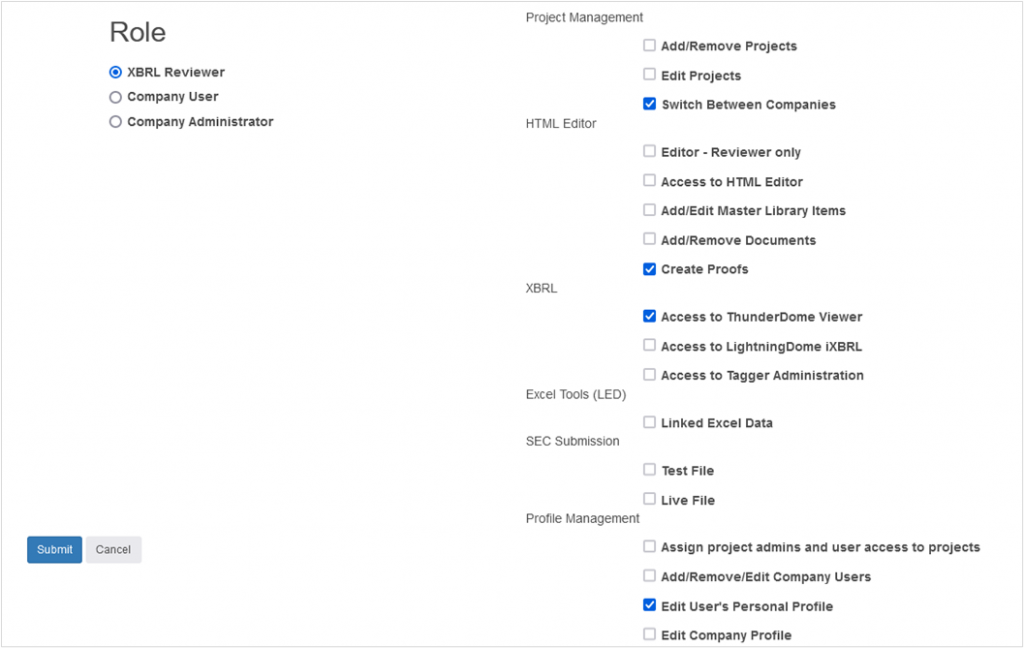 To add or change user permissions, start by selecting the Role, then select or de-select checkboxes to refine the permissions. Checkbox availability depends on the Role. Press Submit to complete the process.