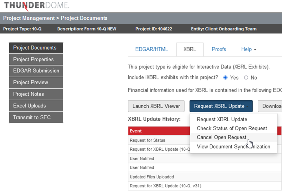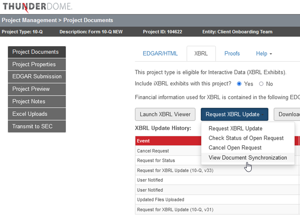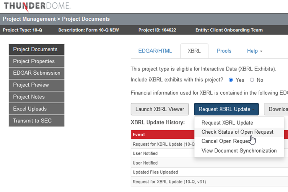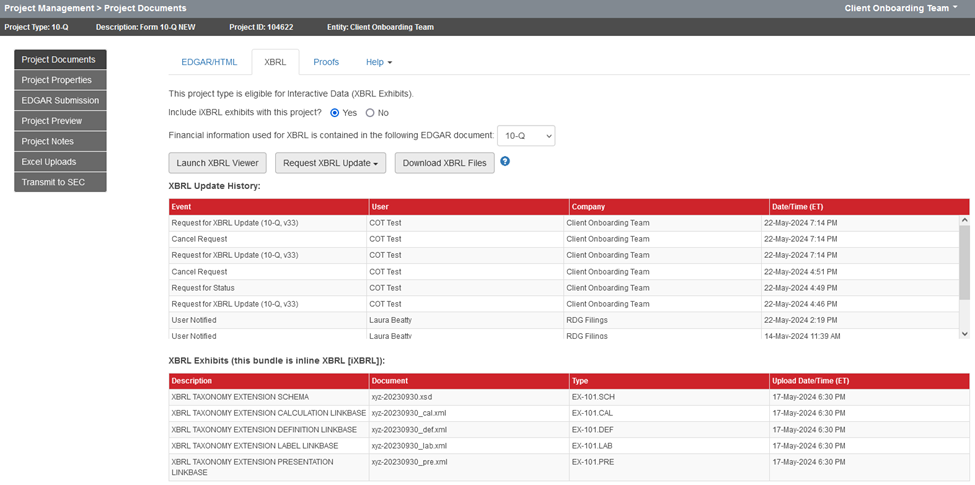 All information related to the XBRL processing of your filing can be located on the XBRL tab of the Project Documents page. You can launch the XBRL viewer to review XBRL, manage XBRL requests, or download XBRL files. You’ll also find a full log of XBRL project history in the XBRL Update History table. Below the XBRL History table you’ll find a list of the XBRL exhibits along with an upload date/time stamp.