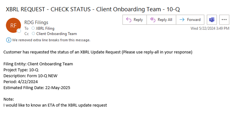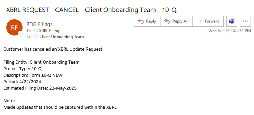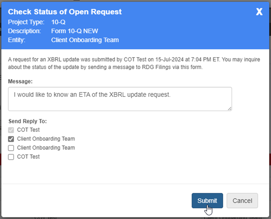 Use this option to send a message to the XBRL communication team regarding the status of your open XBRL request. You may also send an email directly to xbrl@rdgfilings.com.
