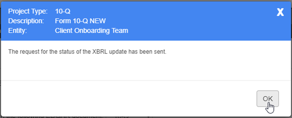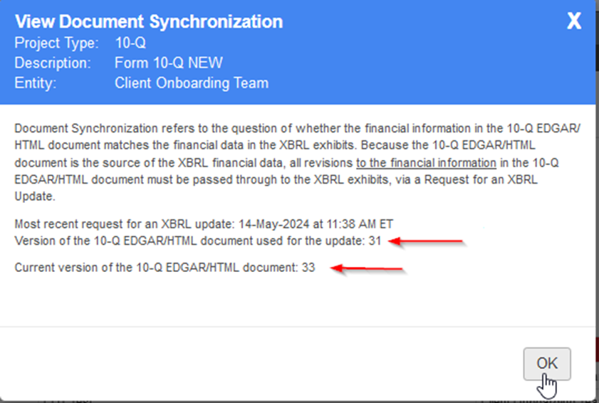 The XBRL update uses the version of the document submitted at the time of XBRL request. Edits made during the XBRL update process are not included in the update; instead, another or final XBRL request will be required to update the most current version of the document. To ensure all edits have been captured ahead of filing, select “View Document Synchronization” to see the current version of the XBRL compared to the EDGAR/HTML document. If the version numbers match, then all edits have been captured. If they do not match, use the “Request XBRL Update” option to synchronize the XBRL and HTML documents.