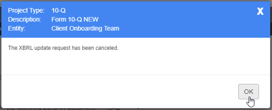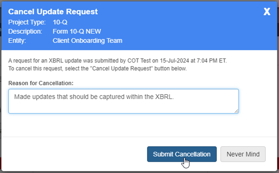 If you have an open XBRL update request and you would like to cancel, select “Cancel Open Request” from the “Request XBRL Update” dropdown. You may need to cancel an open request to capture new changes, or the XBRL team may advise that you cancel and request to capture new changes.