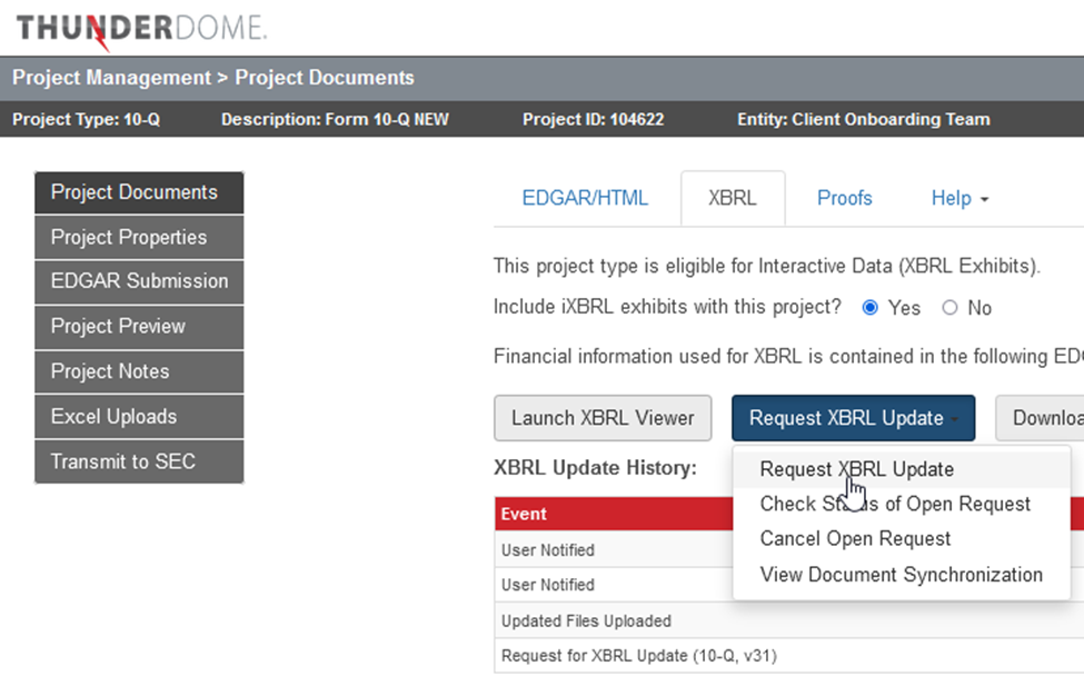 On the Project Documents page, navigate to the XBRL tab and click on the “Request XBRL Update” dropdown. Select “Request XBRL Update.” For more information about the XBRL tab and its options, see Project Management: XBRL.