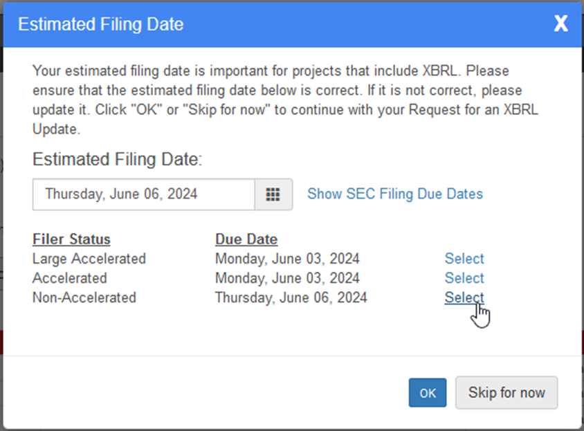 When entering the filing date, you may select “Show SEC Filing Due Dates” and choose from the upcoming SEC mandated filing date, per your filer status.