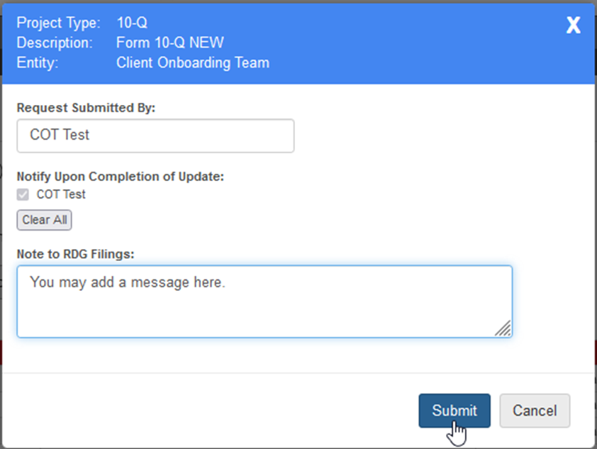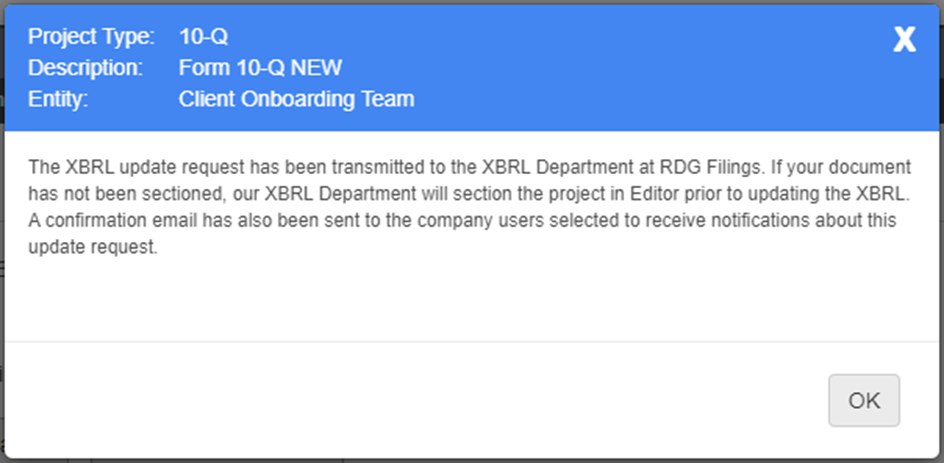 Once all fields are completed, press “Submit” to send the XBRL update request. A confirmation message will appear.