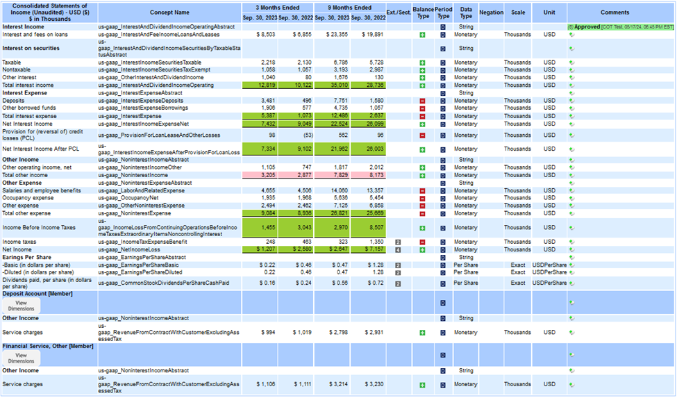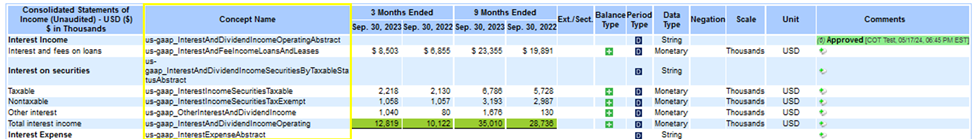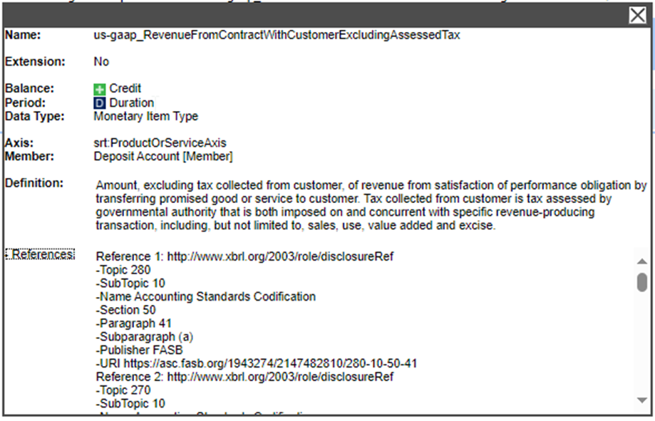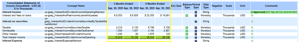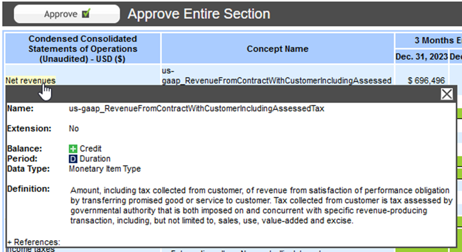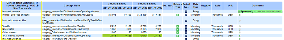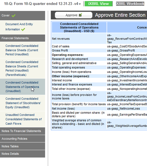After clicking “XBRL Workbook,” find the table or area of the document you’d like to review using the menu on the left.
