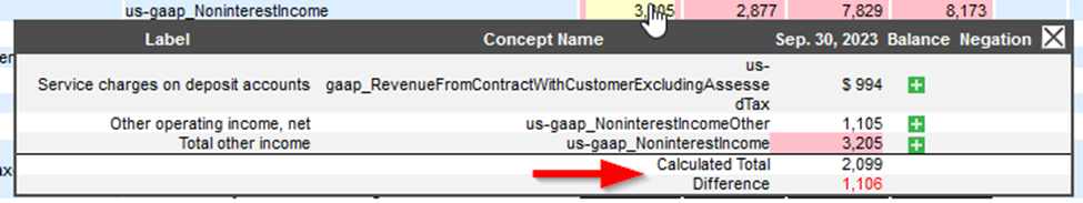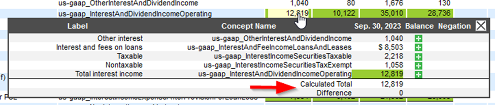 Clicking on any Green or Red total cell will open the calculation validator. This tool displays the actual line items that are used in the calculation linkbase used to define the calculation relationship for that fact.